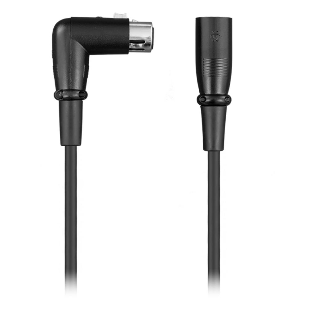 25 ft Premium right-angled XLR-XLR balanced mic cable. Quad conductor, twisted-pair with a braided shield for maximum conductivity. 6 mm PVC jacketed.