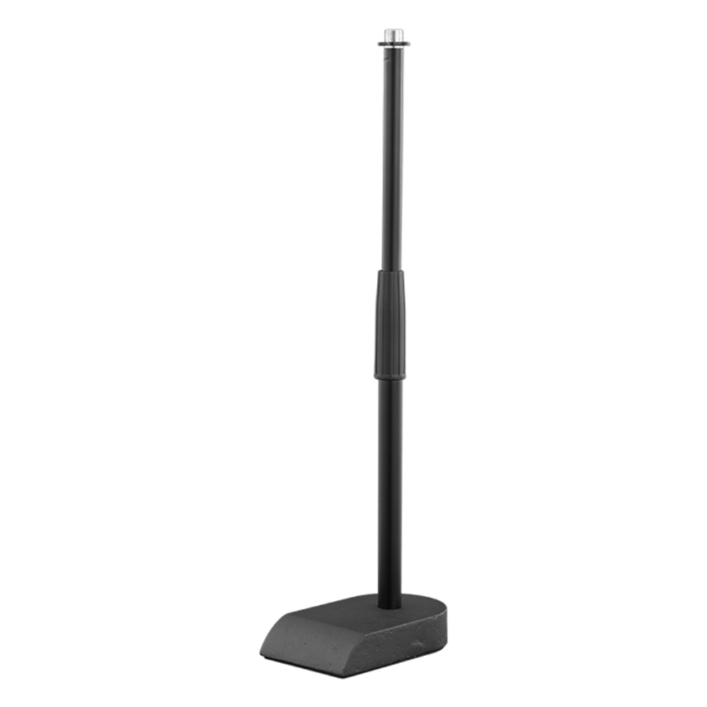Pedestal stand with heavy-duty weighted base. For use with the MicroBoom™ for presentation style vocal. The minimum height is 12.8” and the maximum height is 21”.